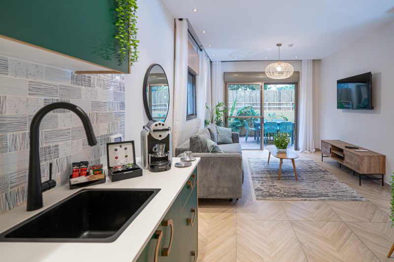 הדירה כוללת מרפסת הפרטית המשקיפה ישירות לבריכה, עם נוף שמעניק תחושת נופש יוקרתית ורגועה. הדירה כוללת מטבח מאובזר הכולל מגוון ציוד וכלי בישול, כולל מקרר, קומקום, מיקרוגל, כירה חשמלית, כלי בישול וכלי אוכל כדי שתוכלו להכין ארוחות כמו בבית.