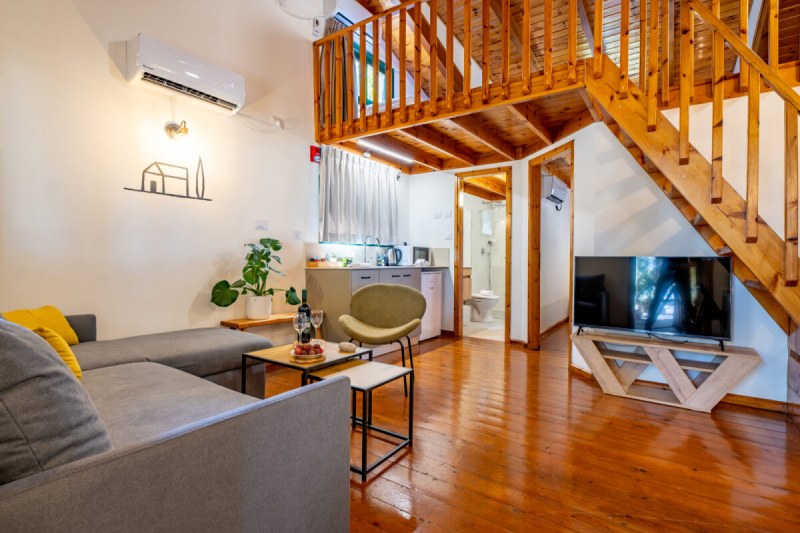 בקתות עץ: בקתות הכוללות חדר שינה זוגי, סלון קטן עם ספה וקומת גלריה עם מזרונים לילדים.