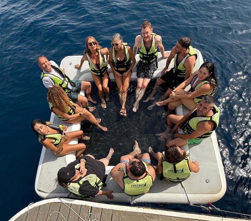ההפלגה כללה הפלגה דרומה לאורך המפרץ, עגינה לצורך שחייה בים וגלישה באחת האטרקציות הכי מרעננות באילת – מגלשה מתנפחת שלקחה אותנו ישירות מהסיפון העליון ועד המים הקרירים של מפרץ אילת. תענוג. במים הכינו מראש בריכה צפה שהיה קשה להפרד ממנה אבל החברים התבקשו לחדר האוכל. לאחר השחיה הצוות של הספינה התארגן על ארוחת צהריים ושתיה, שכשוך קצר בג’קוזי וחזרה למציאות.